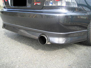 | 安いと思って塗装(他色に)途中のものを安易に買ってしまいました。しかし塗装業者に持ち込んでびっくり、見積もりで¥25000と宣告されました・・・。塗装途中のものは一度落とさないと色がきれいにのらないらしく、はがしの工賃が余分にかかってしまうそうで、何とか交渉の末、¥20000でお願いできました。取り付けは自分でやりましたが、なかなか大変でした。リアバンパーを外さないと取り付けることができないので、2時間くらいかかりました。感想としては純正パーツだけに目立ちすぎず、フィッティングもよくてよいパーツだと思います。ただマフラーによっては取り付けできなかったり、斜め出しのマフラーであれば排気熱で塗装が溶けちゃったりする可能性もありそうです。 | ||
