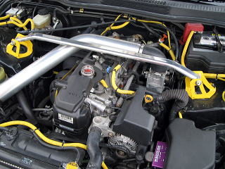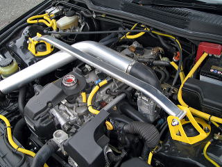 | エアクリーナーを社外に変えたため装着できるようになりました。純正エアクリーナーのままだとエアクリBOXに当たってしまうため取付できないと思います。取り付けてみての印象はたしかに剛性が上がったことが感じられます。まあガンガン走るタイプではないので、やはり見た目です。色合わせのため足の部分を黄色に塗装してみました。元の色はゴールドです。 |